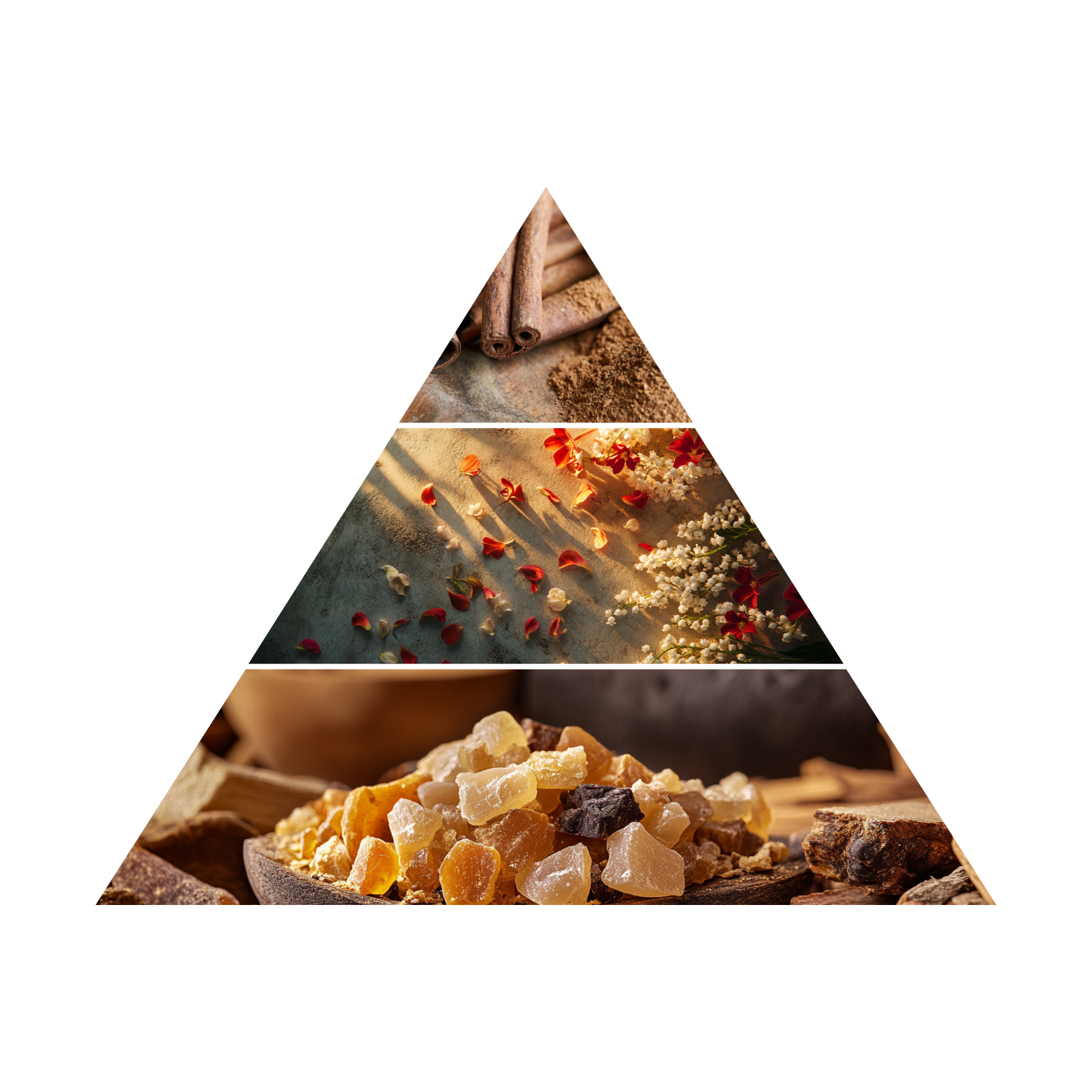 The spicy aromatic note of Cinnamon starts the voyage with caramel that’s sweet as cotton candy. As the day approaches dusk, the reminiscent of cloves spikes in with the magic of carnation and geranium–The flowers with hypnotic spicy essence. The real magic begins when midnight is lightened up with earthy, sensual, warm scents of ambery, moss, and musk.